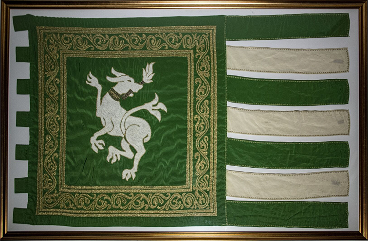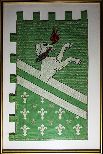 scudo verde con due bande bianche ed un cane rampante bianco con una fiaccola accesa in bocca.
